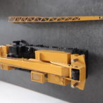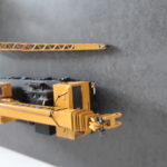 Die Unterwagenkabine erhielt nach der Lackierung auf dem Dach zwei gelbe Rundummleuchten analog dem Heck, die Blinker wurden farblich abgesetzt, der “Liebherr”- Schriftzug an den vom Vorbild bekannten Stellen angebracht, die Verglasungen der Kabinen gereinigt. Oberwagen und Unterwagen zusammengebaut. Um ausreichend Platz auf der Seiltrommel zu haben, wurde diese Vermessen und eine neue auf der Drehbank hergestellt. Beim Einseilen des Modells verwendete ich eine hab so starke, drallfreie Angelschnur. Damit habe ich genügend Volumen, um einen Kranahken auch 4-fach einzuscheren und bis auf die Standfläche reichen lassen zu können.