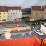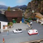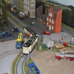 Nur nebenbei möchte ich erwähnen, dass es mir trotz der Maßstabsdifferenzen gelungen ist, meine Dioramen stimmig erscheinen zu lassen. Wie geht das, entspricht die Differenz doch maßlich, zwischen 1:50 und 1:45, absolut gesehen 10 % ? Ich löste das Problem dadurch, dass ich bei den LKW´s konsequent nur Modelle in 1:50 verwendet habe, bei den Vans oder Lieferwagen 1:45 und/oder 1:50 und bei den PKW´s nur 1:45. Da der LKW größer als der Van und der PKW kleiner als der Van ist, fallen in der Szenerie des Dioramas diese Größenunterschiede nicht mehr auf. Als Beispiel mag meine Straßenbahnanlage stehen (s. unten).