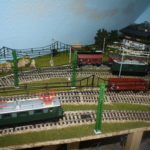 Die Gittermasten und der Fahrdraht sind Eigenbau. Von früheren Anlagen her weiß ich, dass es immer wieder nötig ist, mal in die Oberleitung hinein zu greifen. Dem sollt sie standhalten, wenn man mal hängen bleibt. Das hat mich zum etwas “groben”aber sehr preiswerten Selbstbau greifen lassen. Viel Spaß mit den Bildern.