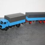 Für den 3-achser mit Nachlauf-Liftachse /-Lenkachse schnitt ich zwei Fahrgestelle entsprechend auseinander und verband sie über einen dünnen Hilfsrahmen miteindander. Danach wurde das Fahrwerk komplett schwarz lackiert. Für den Hilfsrahmen der Pritsche und die Pritsche selbst verwendete ich 1, 5 und 2 mm Polystyrol zur Anfertigung der Teile. Der Anhänger stammt von SIKU aus dem 1:50 Farmer Programm. Hier wurde die Deichsel geändert und der Anhänger erhielt Bordwände aus 2 mm Polystyrol. Der Stern auf dem Kühlergrill muss noch in Weißmetall gegossen und angebracht werden. Außerdem sind noch die Planen für den Zug anzufertigen und die Außenspielgel…