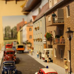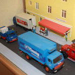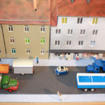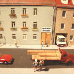 Die Fortsetzung macht ein Straßenzug, aus dem ich später Teile für meine Straßenbahnanlage entnommen habe. Speziell möchte ich auf einen Umstand hinweisen der so nicht gleich ins Auge fällt. Bei dem Straßenzug habe ich Modelle verschiedener Maßstäbe gemischt. Trotzdem entsteht ein völlig geschlossenes Bild. Wie ist das möglich? Ich wollte hier meine 1:50 Modelle in Szene setzen. Sie sind die größten Fahrzeuge auf dem Diorama. Es gibt und gab aber kaum Vans, also Lieferwagen, Kleinlaster in 1:50. sondern meist nur in 1:43,5/45. So verwendete ich, die 1:50 Modelle die ich davon hatte und ergänzte sie mit 1:43,5/1:45 Modellen. Da Vans kleiner als LKW sind und PKW kleiner als LKW und Vans, fällt der Maßstabsuntersied nicht auf. Gleiches gilt für die Figuren. Es gibt große und kleine Menschen, dicke und schlanke. Also habe ich kein Problem 1:45 Figuren mit 1:50 Figuren zu mischen. Im Gegenteil, betrachtet man die Bilder, lassen diese Figuren die Szenen erst richtig belebt erscheinen. So kann ein Mastabmix, geschickt eingesetzt durchaus seien Berechtigung haben. Der schlüssel liegt en dem relatif geringen Größenunterscied zwischen 1:45 und 1:50. Dieser beträgt “nur” 10%, allerdings, würde man einen LKW 1:45 neben einen Typgleichen LKW in 1:50 stellen, wäre dies schon augenfällig.