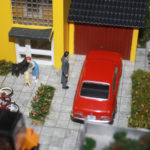 Zur Bilderfolge: Das erste Bild zeigt ein Zweifamilienhaus, wie es vom Stil her in den 1960iger und 70iger Jahren immer wieder überall gebaut wurde. Das haus selbst ist als Halbreliefgebäude gebaut und ermöglicht auch den Einsatz als Übergang zu einer Kulisse, in dem die beiden Hälften mit entsprechender Gestaltung eingesetzt werden können. So auch auf Dioramen. Das gezeigte Landschaftsteil ist 50 cm tief und 1,24 m lang. Die Figuren stammen zum Teil auch von Preiser und Bachmann, vereinzelt auch von Addie.