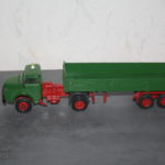 Die schon einmal in einem früheren Beitrag gezeigte MAN Sattelzugmaschine hat aus einem beschädigten Dreiachs Anhänger von Conrad einen kurzen 2-achs Auflieger erhalten. Das Achsaggregat wurde entfernt, ein Rahmen gezeichnet und gefräst und unter die Ladefläche gesetzt. Der Rahmen wurde rot, der Aufbau entsprechend grün lackiert.