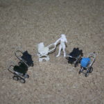 Und hier mein Prototyp eines Kinderwagens gefräst in 16 Teilen und zusammengebaut: Links: der Prototyp, rechts der Prototyp mit den endgültigen Modellen eines Babykinderwagens.