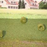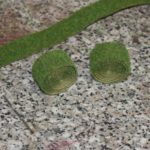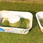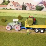 Die Bilder 11 bis 20 zeigen die Herstellung von Heuballen. Dazu wird Grasmatte mit Doppelseitigem Klebeband auf der Rückseite beklebt, in passender Breite und Länge in Bahnen geschnitten und zusammengerollt. Die Stirnflächen werden mit Weißleim bestrichen und im Gras gewendet und trocknen gelassen. Anschließen sind sie bereit zur Verladung auf den Erntewagen.
