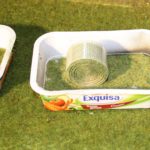 Zunächst habe ich mir eine Schachtel oder kleine Kiste gebaut, die der Größe der LKW-Ladefläche entspricht, zusammensteckbar ist und sich so nach der Herstellung des Ladungseinsatzes zerlegen lässt, um nach der Herstellung ausformen zu können. Ich habe dazu entweder Polystyrolplatten, oder Alublech 0,5 mm benutzt. beide Varianten sind unten bei den Bildern zu sehen. Nach dem Biegen im Schraubstock in der Größe der Ladefläche wurde ein entsprechender Einsatz aus Sperrholz zugeschnitten. Dieser wurde anschließend mit Weißleim bestrichen, dann mit dem Streu bestreut, sodass er leicht gehäuft war. Danach wurde er mit Wasser-Weißleim-Gemisch beträufelt und trocknen gelassen. Nach dem Trocknen wurde ausgeformt. Auf die gleiche Art entstand die Ladung für den Krupp mit gesiebter Erde (Bilder 1-7).