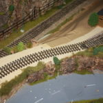 Das erste Bild zeigt eine Bespannung des Hanges mit Packpapier. Dieses wird mit Weißleim bestrichen, danach mit gesiebtem Erdreich eingestreut und nachdem der Hang dann getrocknet ist, mit Grasfasern dicht begrast. Die beim Beziehen entstanden Falten sind gewollt und lassen sich später, wenn die Fläche eingestreut und getrocknet und damit ausgehärtet ist, noch weiter gestalten. Für das Einsteichen verwende ich wasserfestes Ponal. Die Fläche ist nach dem Trocknenen entsprechend hart und damit sehr belastbar.