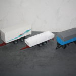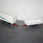 Vor einigen Wochen erstand ich im www. einen Tandemanhänger von Conrad in 1:50. Als das Modell an kam war zuerst die Entäuschung groß. Die Dechsel war abgebrochen. Ärgerlich,denn der Hänger war auf den Bildern völlig intakt gewesen. Glück im Unglück: Ich hatte noch so ein Chassis und so habe ich das Modell zerlegt, den Koffer umgesetzt, das Fahrgestell mit den Anbauten komplettiert und… nein, das kaputte Fahrgestell nicht weggeschmissen, sondern in die Ständerbohrmaschine eingespannt, mittig in die Frontplatte ein Loch gebohrt, und eine neue Deichsel angebaut. Anschließend habe ich dem Cahssis einen Luftkessel, hinten eine Stütze zu Abstellen des Hängers angebaut, mit eigenen Weißmetall Achslagern versehen und ochsenblutrot lackiert. Ich habe eine Pritsche dafür konstruiert und gefräst, zusammeng gebaut und auf das Fahrgestell aufgesetzt. Mit Kotflügeln und Unterfahrschutz ausgerüstet warten diese beiden Modelle nun auf einen entsprechenden LKW als Zugfahrzeug.