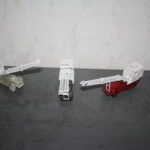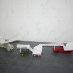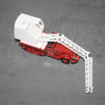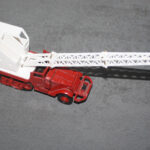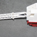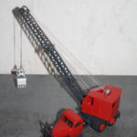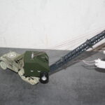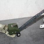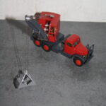 So gab es alle möglichen Fahrzeuge, auch Ketten- und Halbkettenfahrzeuge, die zum Einsatz kamen. Der damals leichte und kleine Fuchs D 300 wurde so z. B. in den Niederlanden, anstatt mit einem Rohrausleger, mit einem Fachwerkausleger und Greifer bzw. Schleppschaufel mit 300 l Fassungsvermögen ausgerüstet, eingesetzt. Er fand Platz als Aufbaukran/Bagger auf LKW und Halbketten LKW der Marke GMC. Ein altes Prospekt war für mich Vorbild für die beiden Geräte unten. Dabei konnte der Ausleger auf einem speziellen gestell abgelegt und die Sptize umgeklappt werden, wie dass an den ersten drei Bildern zu sehen ist. Auch die Modelle bieten diese Möglichkeit.