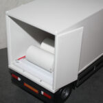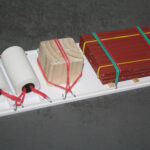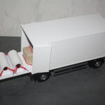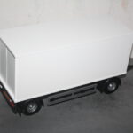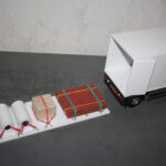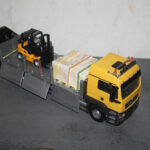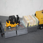 Häufig werden Waren auf Paletten transportiert. Oft sind zigzehn Kartons auf so einer Palette gestapelt. Damit sie beim Transport nicht verrutschen, werden sie gerne mit Strechfolie umwickelt. Im Modell lässt sich das mit Frischhaltefolie darstellen. Ein Verrutschen ganzer Ladungen von Paletten kann man verhindern, in dem man beim Laden, unter die Paletten, Antirutschmatten legt. Im Modell kann man diese mit 600ter Wasserschleifpapier darstellen, das man in entsprechende Streifen schneidet und unter die Paletten legt. Bei den 1:50 Modellen habe ich in den Fahrzeugboden einen zweiten Boden gelegt, auf den ich dann die Ladung und die Sicherungseinrichtungen aufgebaut habe, etwa 1 mm Splinte, deren Augen auf der Oberseite des Bodens die Gummischnur aufgenommen hat, mit der ich die Ladung fixiert habe.
