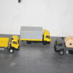 Das hat mich wieder mal “zuschlagen” lassen und aus dem Fundus noch unbearbeiteter Modelle drei Postautos entstehen lassen. Dabei wurden zwei LKW nach Vorbild von Mercedes als LKW-Zugmaschinen für den Kabelbau bzw. Fernmeldedienst in Rapsgelb und zeltgrau lackiert und ein MAN L 2000 in gelb als Planenfahrzeug im allgemeinen Postdienst.