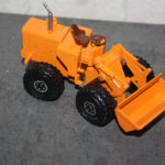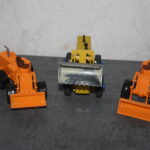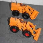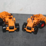 Das Modell von Shinsei ( aus den 1970igern) ist sehr einfach gehalten. An den Hubarmen ist die Kinematik für die Schaufel fest mit vergossen und nicht beweglich, ähnlich wie bei den Matchbox Modellen des Muril Hill, oder des Aveling Barford Laders. Allerdings ist bei dem Michigan 45 von Shinsei die Schaufel beweglich angebracht. Ich habe bei einem meiner zwei Modelle des Michigan 45 die etwas plump wirkenden Räder durch andere errsetzt, Die Kolbenstangenm der Hydraulik silbriert, den Kühlergrill geschwärzt, die Scheinwerfer und Rückleuchen entsprechend abgesetzt und den Stummelauspuff nach oben verlängert. Wie dere Vergleich zeigt, kann man auf diese Weise ein Modell, ohne großen Aufwand, noch etwas vorbildtreuer werden lassen…