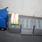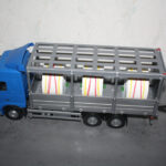 Um im Orignal der Fahrphysik entgegenzuwirken und damit Unfälle, teure Fahrzeugreparaturen nach Beschädigungen, oder ein Verruschten der Ladung zu verhindern, was große Auswirkungen auf das Fahrverhalten hat, verwendet man beim Original zuerst als Unterlage auf der Ladefläche, Anti-Rutschmatten (unten im Bild grau dargestellt). Sie werden so ausgelegt, dass die Ladung richtg darauf steht. Auch hier wurde, wie schon mehrfach erwähnt, 600ter Wasserschleifpapier zur Darstellung der Anit-Rutschmatten verwendet. Die einzelnen Rollen sind auf Transportgestellen gelagert und mit Gurten darauf befestigt. Papier ist schwer, weshalb auf einen unbeschädigten Zustand der Gurte geachtet werden muss. Das Gleiche gilt auch für die Gurte, mit denen das Ladegut auf der Pritsche gesichert werden muss. Solche Rollen lassen sich auch stehend transportieren. In deisem Fall ließen gewicht und Größe einen Transport auf Paletten zu…