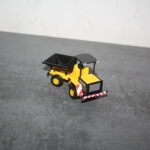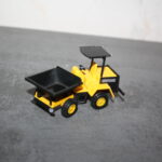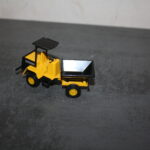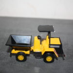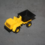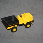 Wenn wir das oben gezeigte Modell betrachten so mutet mich das Modell doch sehr minimalistisch an. Es ist reduziert auf seine Grundform, nüchtern und schnörkellos. Im wesentlichen ist es beschränkt auf zwei Teile, einen Vorderwagen mit einer kleinen Kippmulde über den Vorderrädern und einen Hinterwagen mit einer Motorverkleidung zwischen einem Sitz und den Hinterrädern. Verbunden ist beides mit einem Zapfen, um das das Modellchen sich schwenken und damit lenken lässt, seiner Knicklenkung.