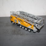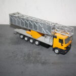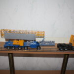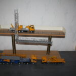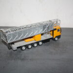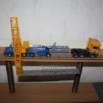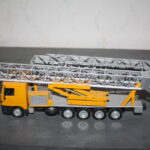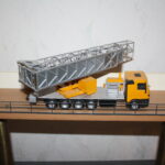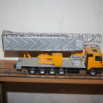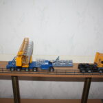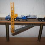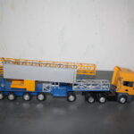 Die beiden Großgeräte lassen sich im Fahrgestell in der Höhe um ca. 3 mm verstellen. Das Modell als Auflieger kann vom Motorwagen getrennt werden und besitzt eine eigene lenkbare Vorderachse. In Transportstellung sind die beiden ersten Achsen des Aufliegers ca. 3 mm von der Aufstandsfläche abgehoben. Mit dem Schraubenzieher im letzten Bild kann die Höhe des Modell verändert werden.