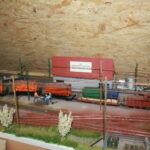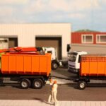 Bemerkenswert, dass Fleischmann in seinem Magic Train (MT) Sortiment einen LKW und einen Waggon mit je einem hohen Behälter, wie er vielfach im Recycling zum Einsatz kommt, im Programm gehabt hat. Er passt mit seinen Maßen auch gut auf 1:50 Modell LKWs, weshalb ich einigen Waggons von MT einen Hilfrahmen gab, der sich schwenken lässt. Nun kann man so einen Wechsel von Schiene zu Straße auf der Anlage auch darstellen. Die Bilder unten zeigen den von mir gebauten LKW-Zug und einen der Waggons, die ich entsprechend umgebaut habe. Da ich meine Bahn als Spielbahn konzipiert habe, wird einleuchten, dass der Wechsel händisch erfolgt.