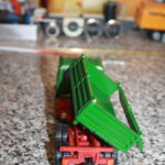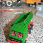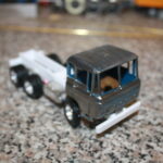 Ich fertigte zunächst nach den Maßen im Buch einen Rahmen an, baute die von mir gegossenen Anbauteile, wie Tank, Luftkessel, Auspuff ,Batteriekasten, etc. an, ebenso die Schwingen der Hinterachse ein und das Getriebe mit Kardanwelle und die Lenkung und setzte die Kabine auf. Für ihre Befestigung ist im Rahmen vorne noch eine Nut einzufräsen, dann kann das FH aufgesetzt werden. Vorgesehen ist ein 3-Seitenkipper. Da ich aber zu faul bin, diesmal einen echten 3-Seitenkipper aufzubauen und dann zu montieren, werde ich den Kipper nicht wie üblich hinten anlenken, sonderen auf der rechten und linken Seite und ihn damit zum Seitenkipper machen. So kann der Kipper nach rechts oder links kippen.