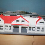 Inzwischen wurde, nach dem Streichen der weißen Dächer in rot, noch eine farbliche Nachbehandlung vorgenommen. Nun erscheint das Dach eher in einem rotbrauenen Ton, als schreiend rot. Trotzdem fällt auf, dass das Gebäude eingentlich zu schmal ist, vergleicht man die Fotos des Modells mit dem Vorbild. Im Moment überlege ich, wie ich das ändern kann. Einige Ideen habe ich schon… Warten wir ab ob und wie es gelingt. Auch ein Neubau ist dabei in Betracht gezogen. Immer wieder überrascht mich die unerbittlichkeit einer Kamera. Betrachtet man das Modell nicht durch die Linse der Kamera, fallen die weißen Flecken kaum auf. Auf den Fotos ist das ganz anders. Ich werde also nochmal mit der Farbe aktiv werden…