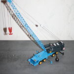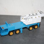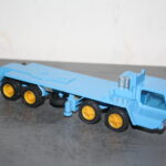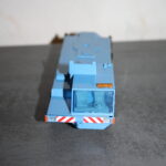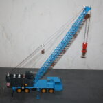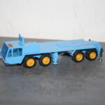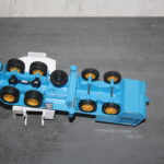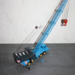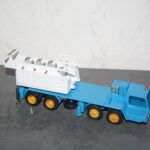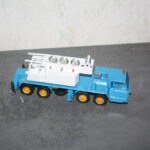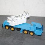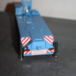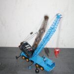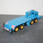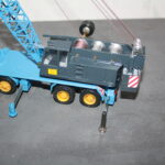 Es sollte ein 4-achsiger, 40 bis 50 Tonnen tragender Autokran werden. Doch vorher war das Fahrgestell erst einmal zu restaurieren. Es hatte starke Lackabblätterungen, der Lack wirkte, als wäre das Metall nicht wirklich richtig entfettet worden. In der Kabine gähnte die Leere, die schwarzen Felgen mit den Reifen wirkten kaum. So entschloss ich erst einmal das Modell zu entlacken, neu zu grundieren und zu lackieren. Nach der Zerlegung wurden die Scheiben gereinigt, in meinem Räderfundus suchte ich mir passende Räder aus. Die Kabine erhielt eine Einrichung, zwei Sitze, ein Armaturenbrett mit Lenkrad, hellgrau lackiert, damit man sie auch sieht, zwei paar Unterlegkeile, Scheinwerfer silbern abgehoben und Blinker wurden angebracht, rot-weiße Chevrons vorne und hinten, auch zwei Rundumleuchten und Rückleuchten und ein Schild: ” Achtung Fahrzeug schert aus”.
