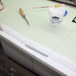 Basis für dieses Feld ist eine 3-4 cm strake Styrodurplatte. In Bild 1 sieht man gut den in die Platte eingeschnitten Graben mit eingelassenem Rohr für einen Durchlass. Nach dem Herausschneiden des Grabens wurde dieser gleich mit Wasser-Weißleim-Gemisch eingestrichen und mit einer Mischung aus Erde und Sand eingestreut. Nach dem Trocknen dieser ersten Bearbeitung habe ich den Fahrweg gestreut und mit Fahrspuren versehen. Dazu habe ich einen Traktor mehrmals darüber gerollt. Hinterher habe cih die Räder von daran klebenden Erdrest und Sandkörnern befreit.