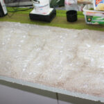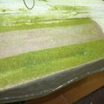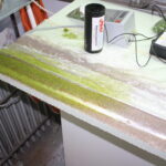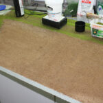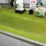 Nach dem diese Arbeiten abgeschlossen waren und der Kleber getrocknet war, habe ich zuerst Erde-Sand-Gemisch als Untergrund für das Feld aufgebracht und nach erfolgtem Trocknen darauf dann begrünt. Da ich auf dem Schaustück zeigen wollte, wie Grünfutter gemäht und eingebracht wird, habe ich zuerst auf der ganzen Fläche ca. 2,5 mm hohes Gras aufgebracht. nach dem Trocknen dieser Fläche habe ich einen Teil abgedeckt und den Verbliebenen unabgedeckten Teil mit gemischten Grasfaseren satt begrünt. Das Ergebnis in Bild 6 und 7 spricht für sich.