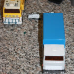 Anders als der Ford LKW (Bild rechts) das Modell des Berliet aufgebaut. Es hat eine angesetzte Kunststoffstoßstange. Beide Modelle hatte ich schon mit Kabinen mit einem geschlossenen Dach, das in den 4 Ecken je ein Loch aufweißt und Kabinen mit Dächern, die ein zusätzliches, großes Loch in der Dachmitte (Bild rechts). Diese Löcher müssen irgendwie geschlossen werden, oder entweder mit einer selbst angefertigten, neuen Dachhaut überzogen werden, oder sie erhalten nach dem Umbau das alte, weiße Dach wieder.