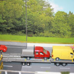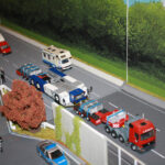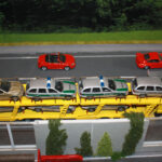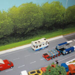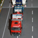In der unteren Bildreihe sind die Fahrzeuge auf der dreispurigen Autobahn eingereiht. Im Bild 7 sieht man den Unterscheid zwischen den beiden LKW auf der rechten und der mittleren Spur mit den gesicherten Fahrzeugen und dem Mercedes Van, dem diese Sicherung noch fehlt. Die Modelle wirken irgendwie echter, obwohl Ihnen auch noch teilweise die Spiegel fehlen.