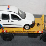 Das zweite Fahrzeug ist ein Plateauwagen zum Transport von Vans. Hier wurden, wie beim Transporter oben auch die Räder mit Stoppern und Gurten über die Reifen fixiert. Das Problem bei Fahrzeugtransporten ist der Umstand, dass die Karosserien federnd auf dem Fahrgestell sitzen und bei Unebenheiten der Straßen mit ein- und ausfedern. Diese Bewegung lässt sich nicht vermeinden, weshab darauf zu achten ist, dass die Befestigung der LKW´s, Vans und PKW´s über die Räder und/oder auch die Achsen erfolgt.