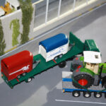 Bild 5 und 6 zeigen einen Tieflader beladen mit einem Hächsler von Claas. Deutlich zu erkennen die Sicherung der Ladung mit Ketten, und das Mähwerk und die Räder mit Zurrgurten. Die Begrenzungsschilder fehlen auch nicht. Sie müssen sein, da das Gespann breiter als 2,50 Meter ist.