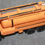 Nach ausführlicher Begutachtung der Schäden begann ich behutsam zunächst die noch vorhandenen Nieten aus den Scharnierösen zulösen. Nachdem das geglückt war, fertigte ich zunächst aus 2 Spliinten d= 1,5 mm zwei Scharnierösen an, sägte die abgebrochenen Ösen an Behälterr ab, bohrte mit einem 1.5 mm Bohrer in die Halter oberhalb des Kessels zwei Löcher 1.5 mm, klebte die beiden gekürzten Splinte ein und befestigte den Deckel, dessen Scharnier,ösen unversehrt geblieben waren, wieder am Kessel. Aus einem Evergreen Röhrchen, das ich behutsam von Hand von 1mm auf 1.5 mm aufbohrte fertigte ich zwei Hydraulikrohre zum Klappen des Deckels an und aus zwei weiteren Splinden die Augen für die beiden Hydraulikrohre. UNd nochmals aus zwei Spliten entsanden durch Kürzung derselben die Hydraulikstmpel für den Deckel.
