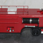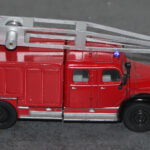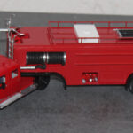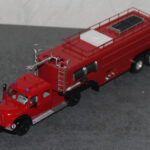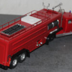 Als weiteres Modell stelle ich hier eine Modell vor, das eine real existierendes Vorbild hat. 1958 wurde von Magirus, aufgrund des zunehmenden Luftverkehrs und der Einführung der Jets Boeing 707, Caravelle und DC 8, DC9 De Havilland Comet in den Luftverkehr und dem lauter werdenden Ruf beiden Flughafenfeuerwehren nach leistungsfähigen Löschfahrzeugen ein Bolide vorgestellt, der bisher seinesgleichen suchte. Die Ulmer hatten ein Fahrzeug, auf der Basis des Magirus 6500 Rundhaubers als Sattelzugmaschine zunächst mit Normalkabine entwickelt, später auch mit der unten sichtbaren Staffelkabine als großes FLF. Es war der Beginn, der Auftakt zu den Entwicklungen ohne die heute die moderne Luftfahrt mit den Großraumfliegern wie Boeing 747 oder Airbus A 380 nicht denkbar währen.
