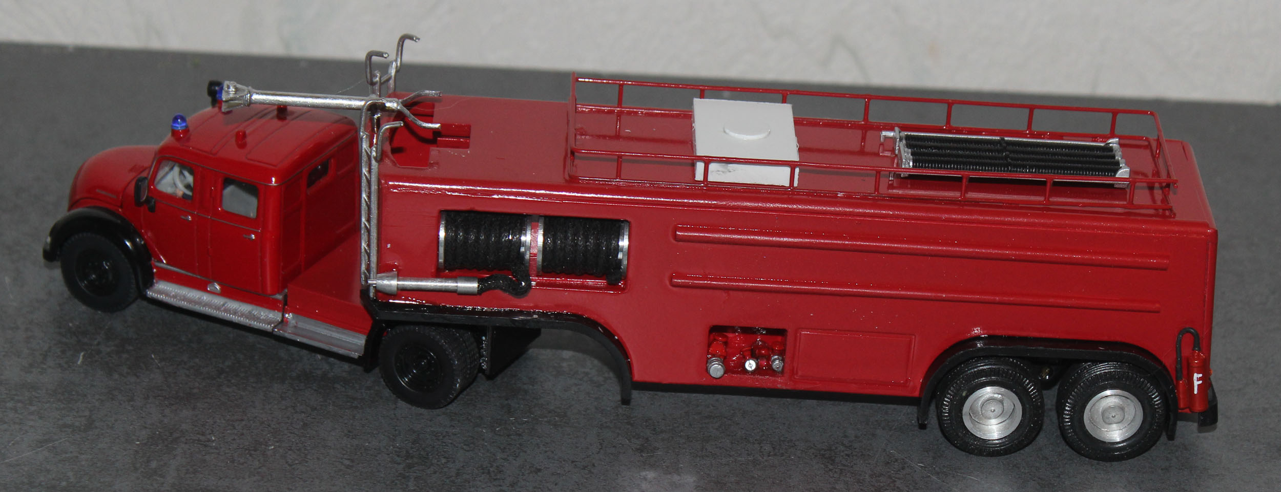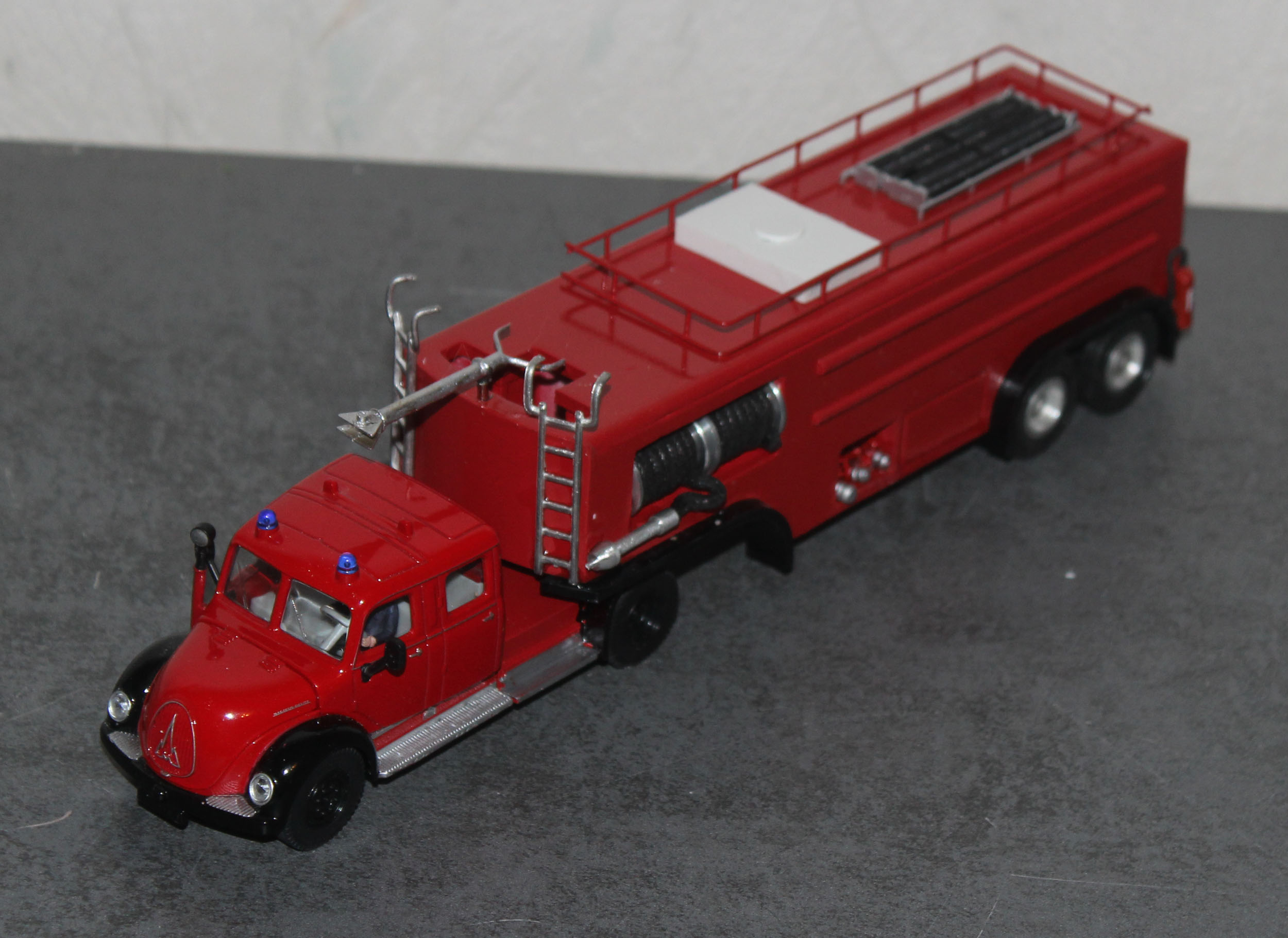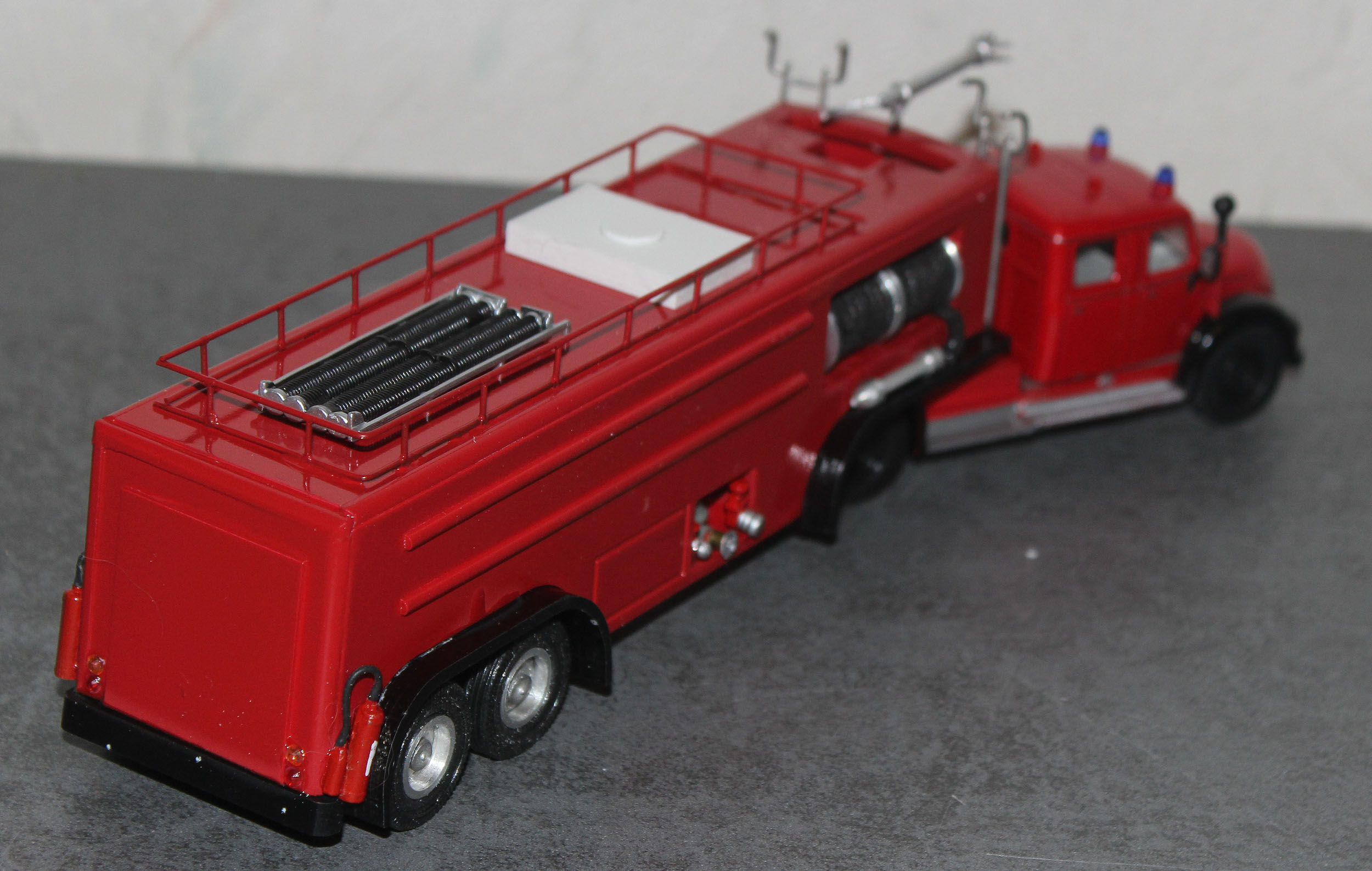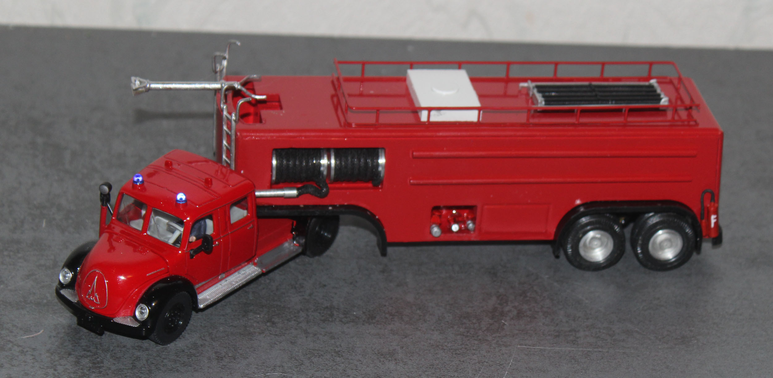 Als weiteres Modell stelle ich hier eine Modell vor, das eine real existierendes Vorbild hat. 1958 wurde von Magirus, aufgrund des zunehmenden Luftverkehrs und der Einführung der Jets Boeing 707, Caravelle und DC 8, DC9 De Havilland Comet in den Luftverkehr und dem lauter werdenden Ruf beiden Flughafenfeuerwehren nach leistungsfähigen Löschfahrzeugen ein Bolide vorgestellt, der bisher seinesgleichen suchte. Die Ulmer hatten ein Fahrzeug, auf der Basis des Magirus 6500 Rundhaubers als Sattelzugmaschine zunächst mit Normalkabine entwickelt, später auch mit der unten sichtbaren Staffelkabine als großes FLF. Es war der Beginn, der Auftakt zu den Entwicklungen ohne die heute die moderne Luftfahrt mit den Großraumfliegern wie Boeing 747 oder Airbus A 380 nicht denkbar währen.