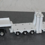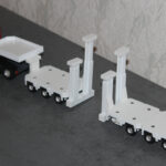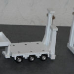 Zunächst habe ich die Module des Transporters gezeichnet und gefräst, zusammen gebaut und danach mit der Zugmaschine kombiniert. Die Räder sind alle lenkbar aufgehängt. Ein 3-achsiges Modul für das Dolly hinter der Zugmaschine und ein 5-achsiger Nachläufer bestehend aus einem 3- und einem 2-achsigen Modul. Angebaut werden muss noch die Aufnahme für das konische Rohr. Es entsteht aus verschiedenen Evergreen Profilen, die auch frästechnisch bearbeitet werden.