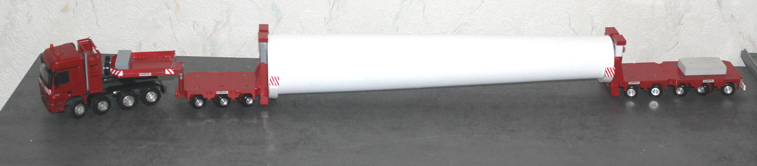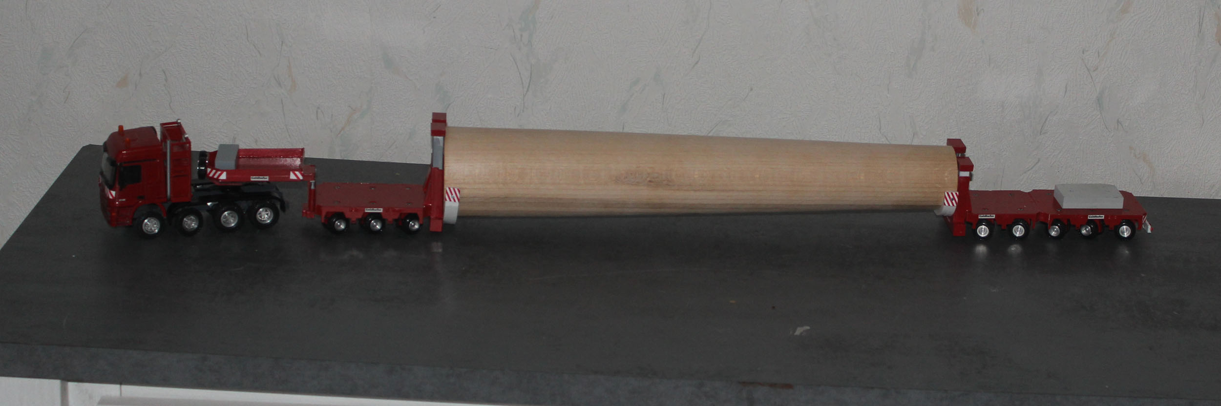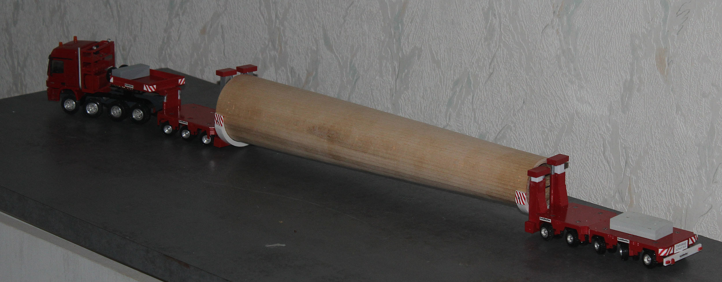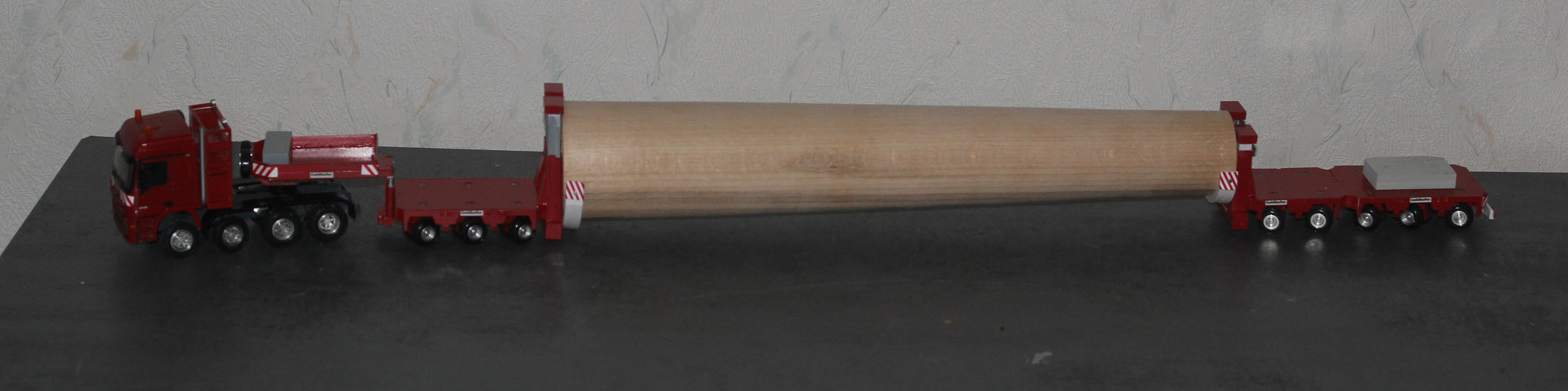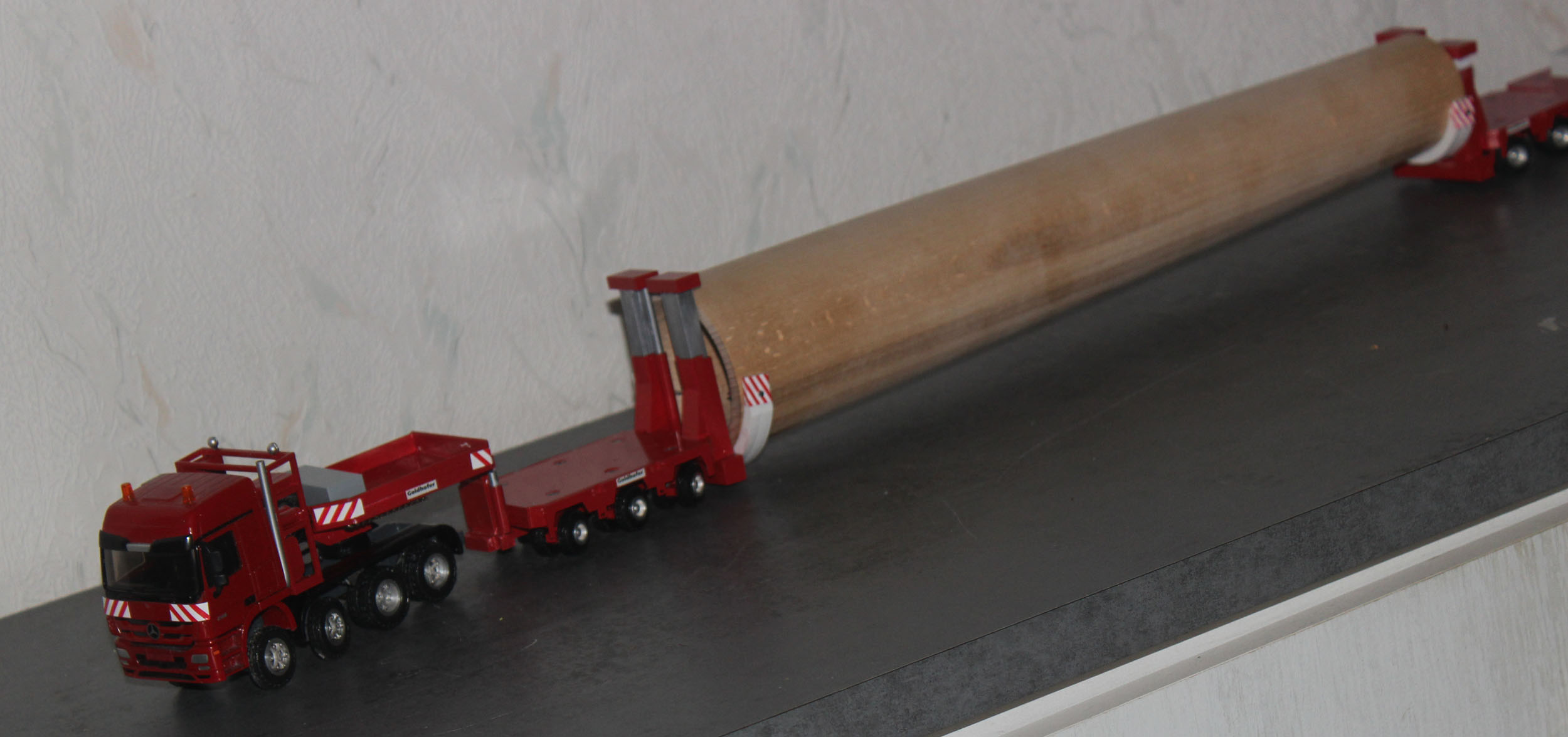 Zu einem der zwei kurzen Actros Zugmaschinen die zuletzt mit den Siku Fahrerhäusern entstanden sind, entsteht im Moment ein Masttransporter. Die Mastsegmente sind im Original zwischen 20 und 30 m lang, was in 1:50 bedeutet, dass eine solche Sektion 40 bis 60 cm lang wird. Reizvoll wäre auch der Bau eines Transporters für den Transport eines Rotorblattes.