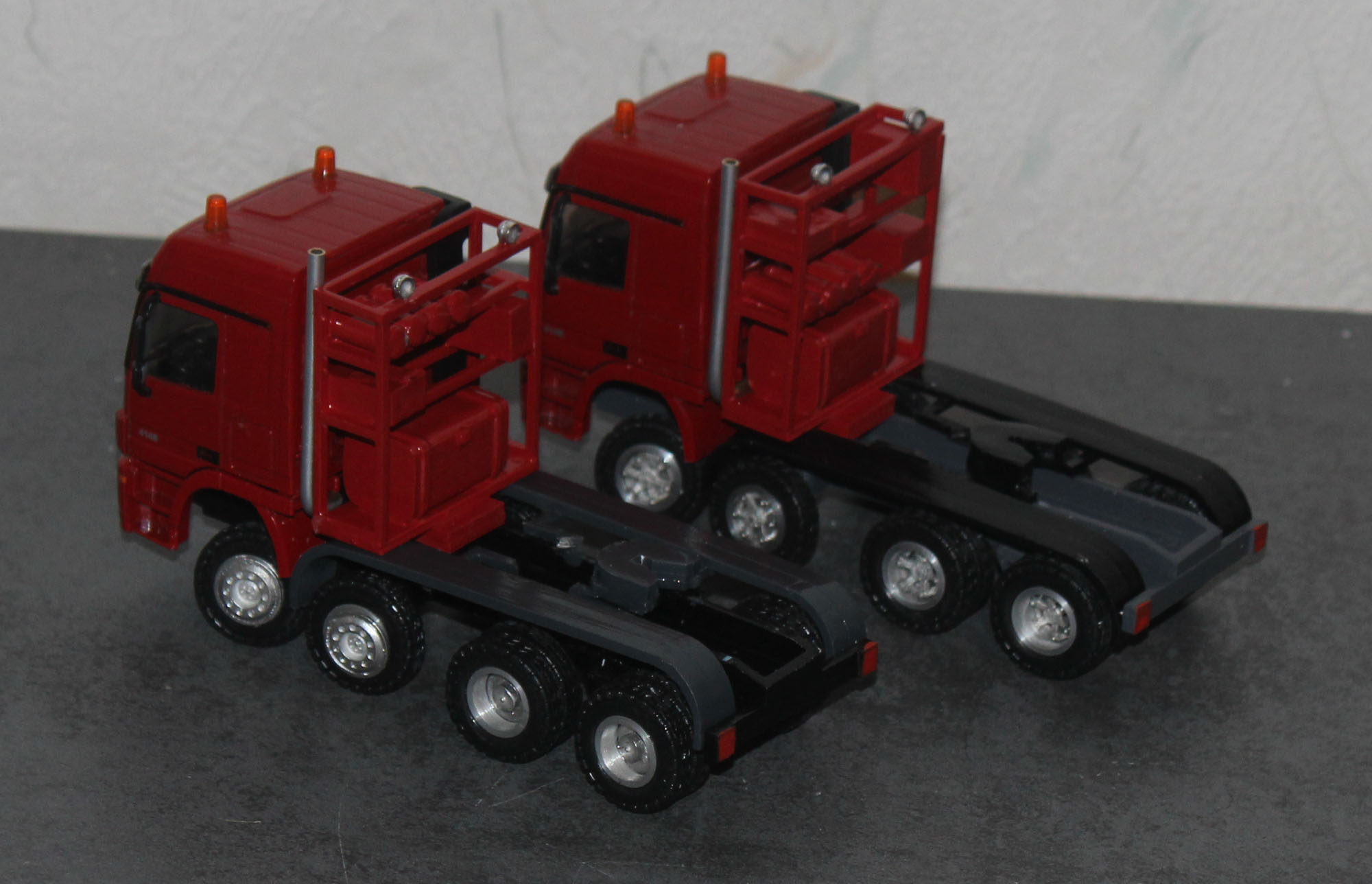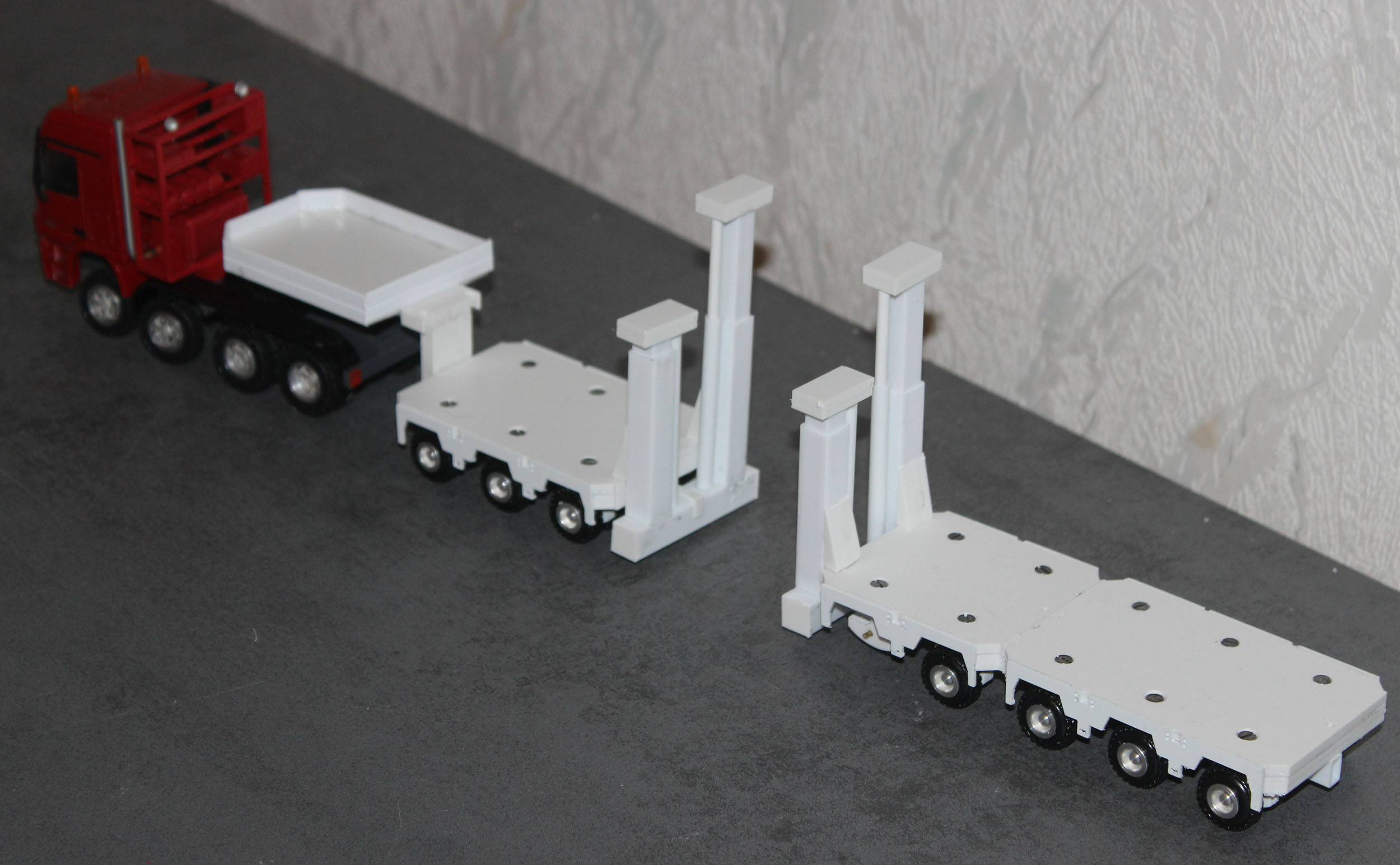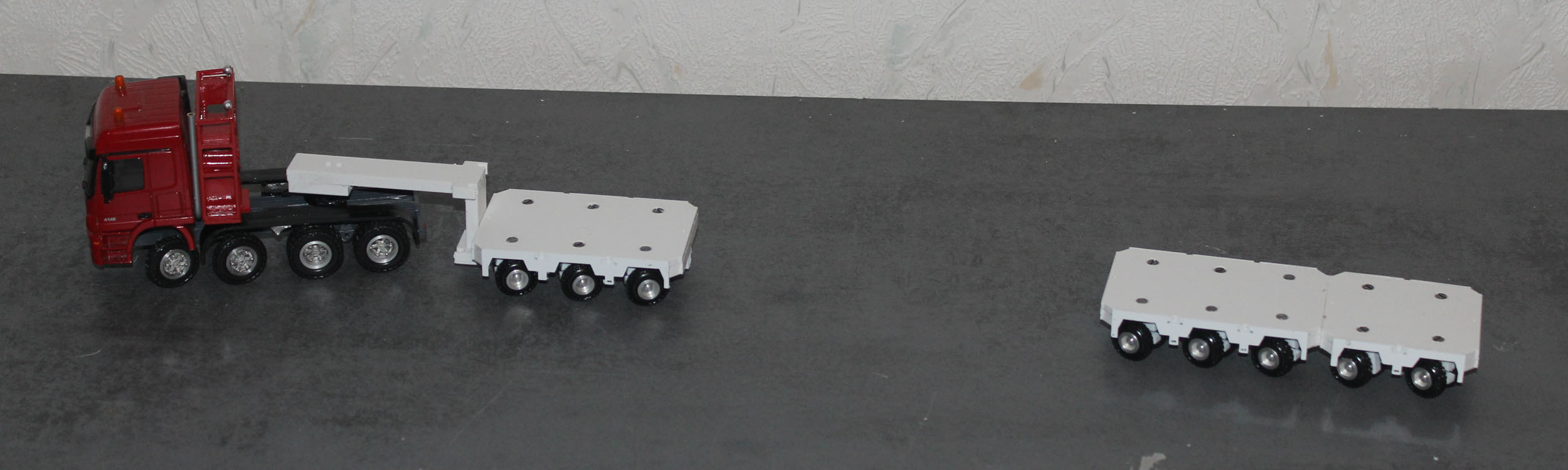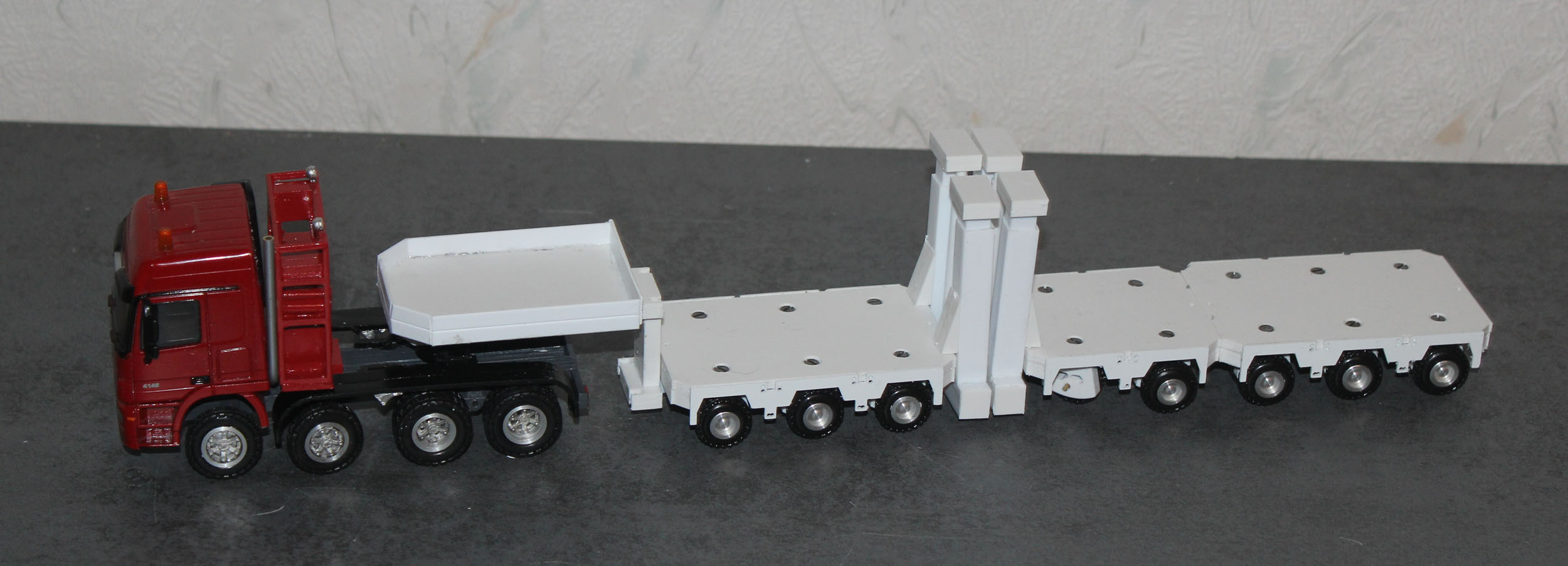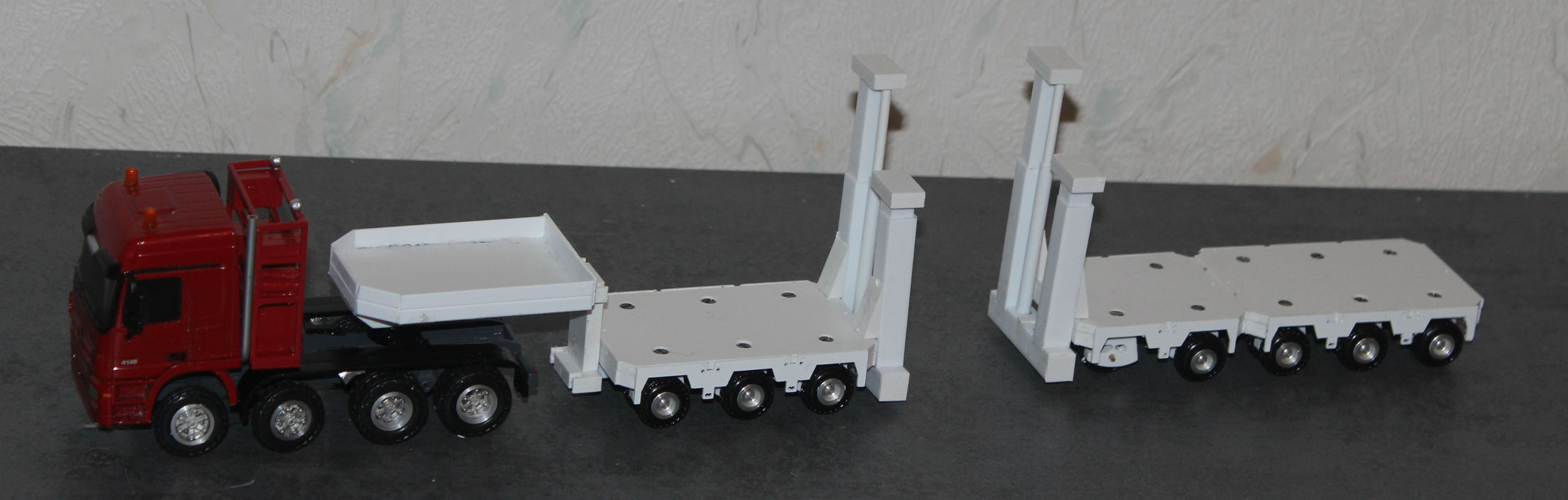 Zu einem der zwei kurzen Actros Zugmaschinen die zuletzt mit den Siku Fahrerhäusern entstanden sind, entsteht im Moment ein Masttransporter. Die Mastsegmente sind im Original zwischen 20 und 30 m lang, was in 1:50 bedeutet, dass eine solche Sektion 40 bis 60 cm lang wird. Reizvoll wäre auch der Bau eines Transporters für den Transport eines Rotorblattes.