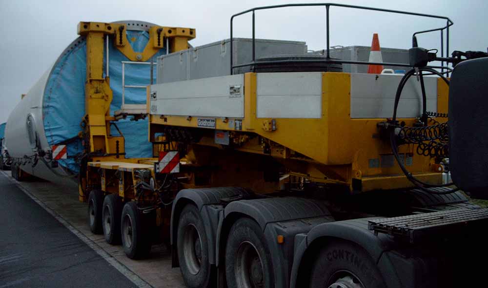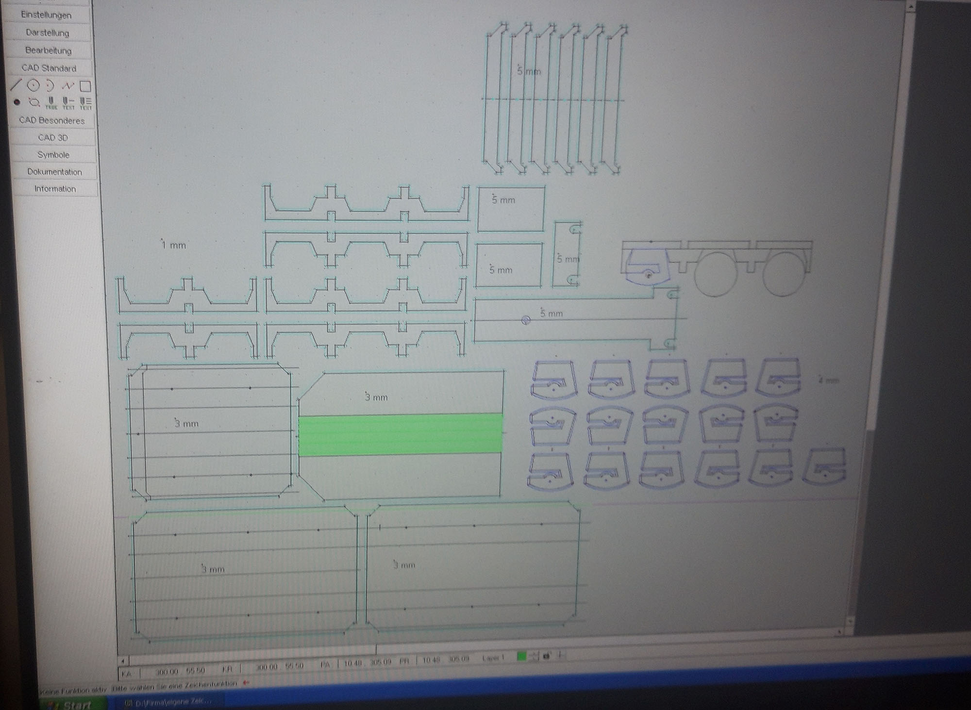 Zunächst habe ich die Module des Transporters gezeichnet und gefräst, zusammen gebaut und danach mit der Zugmaschine kombiniert. Die Räder sind alle lenkbar aufgehängt. Ein 3-achsiges Modul für das Dolly hinter der Zugmaschine und ein 5-achsiger Nachläufer bestehend aus einem 3- und einem 2-achsigen Modul. Angebaut werden muss noch die Aufnahme für das konische Rohr. Es entsteht aus verschiedenen Evergreen Profilen, die auch frästechnisch bearbeitet werden.