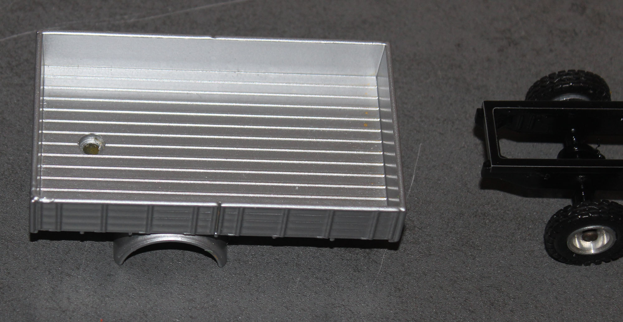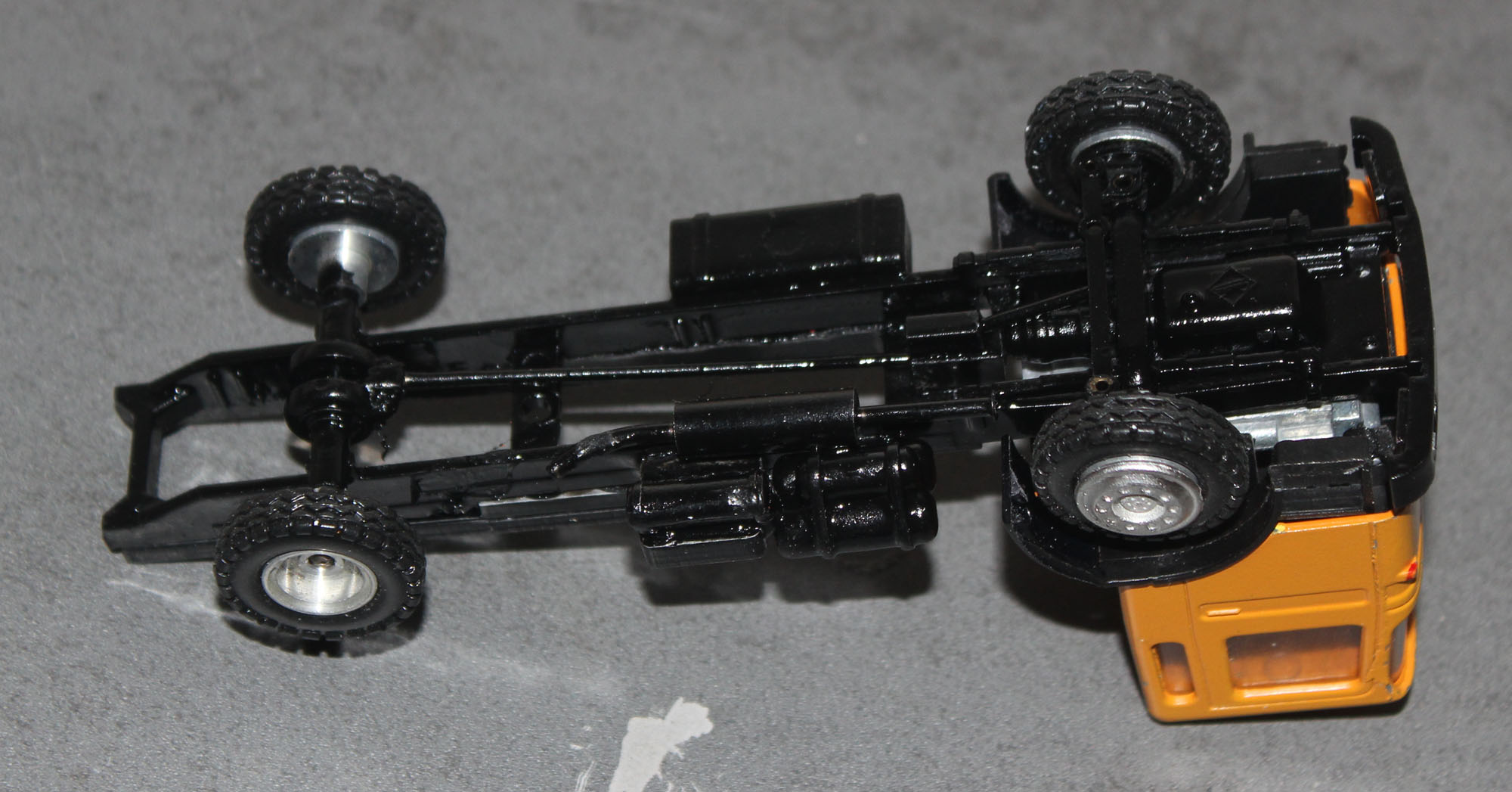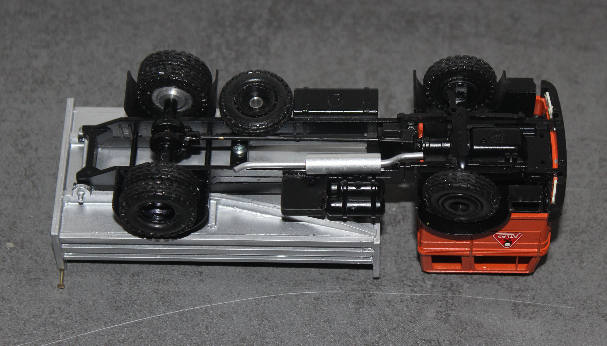 Doch betrachten wir zunächst mal die Fahrgestelle von unten. Dabei fällt auf, dass neben dem Tank und den Luftkesseln wesentliche Details fehlen. So der Batteriekasten und der Auspuff und die Kardanwelle. Diese Teile lassen sich leicht selbst anfertigen und anbauen. Betrachtet man die Fahrgestelle weiter, fällt auf, dass sie an der Hinterachse Einzelbereifung tragen. Soll das evtl. auf einen Allradtyp hinweisen? Man könnte so denken und eines der beiden Fahrzeuge entsprechend ausrüsten. Was dann aber auch zur Andeutung eines zweiten Getriebes am Modell führen sollte und einer Kardanwelle zur Vorderachse…