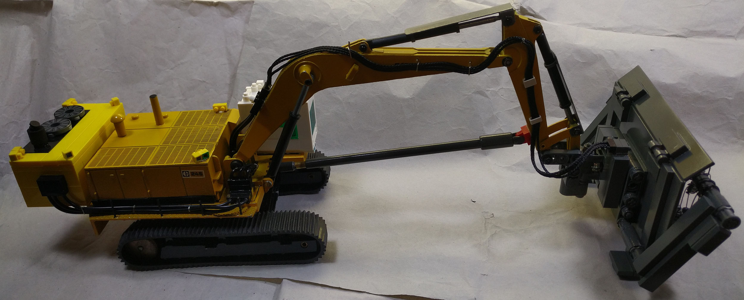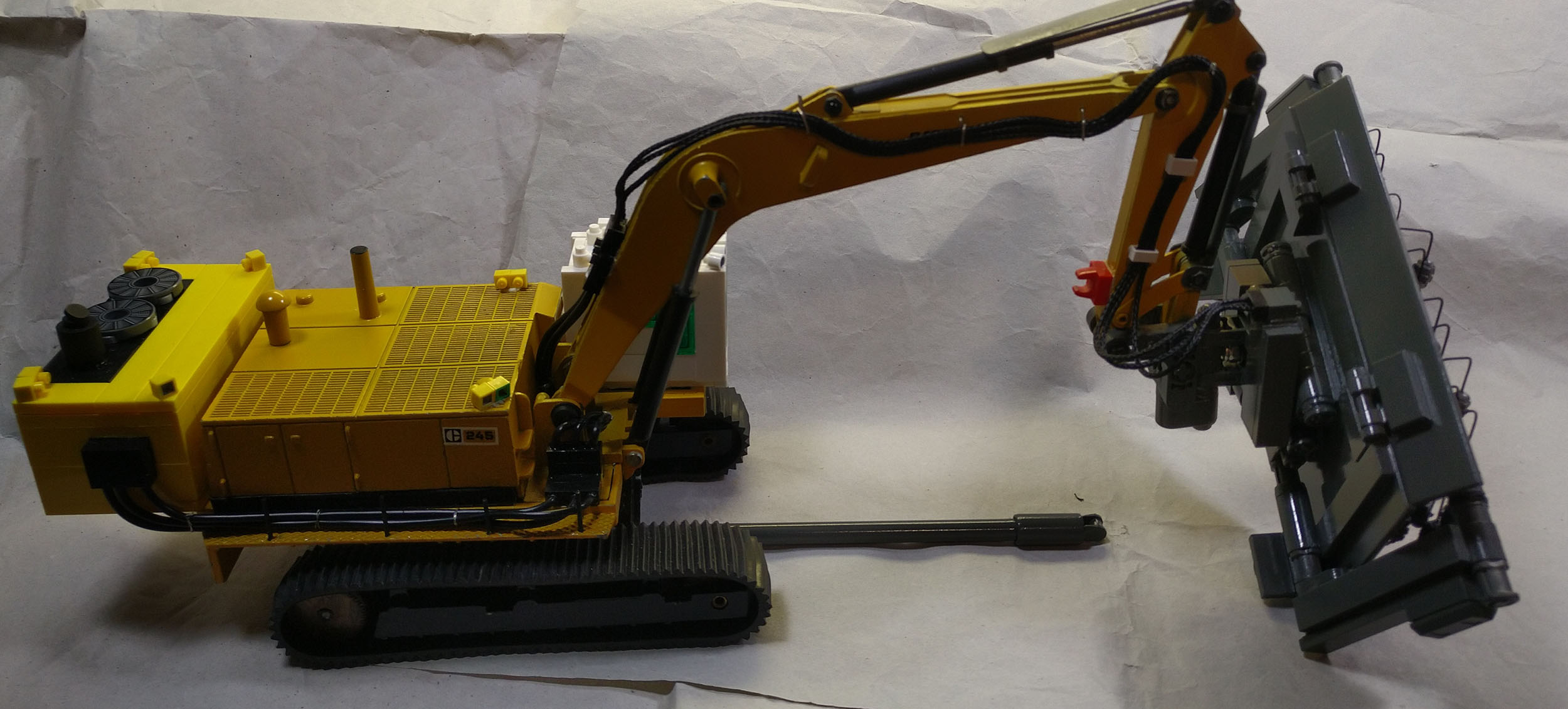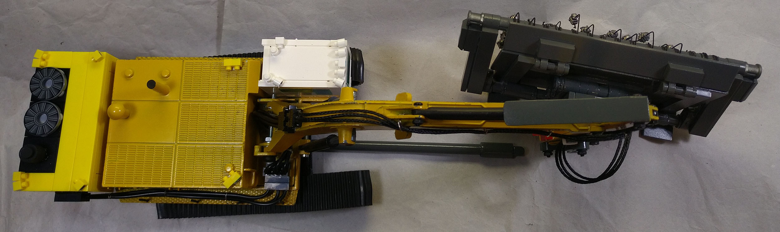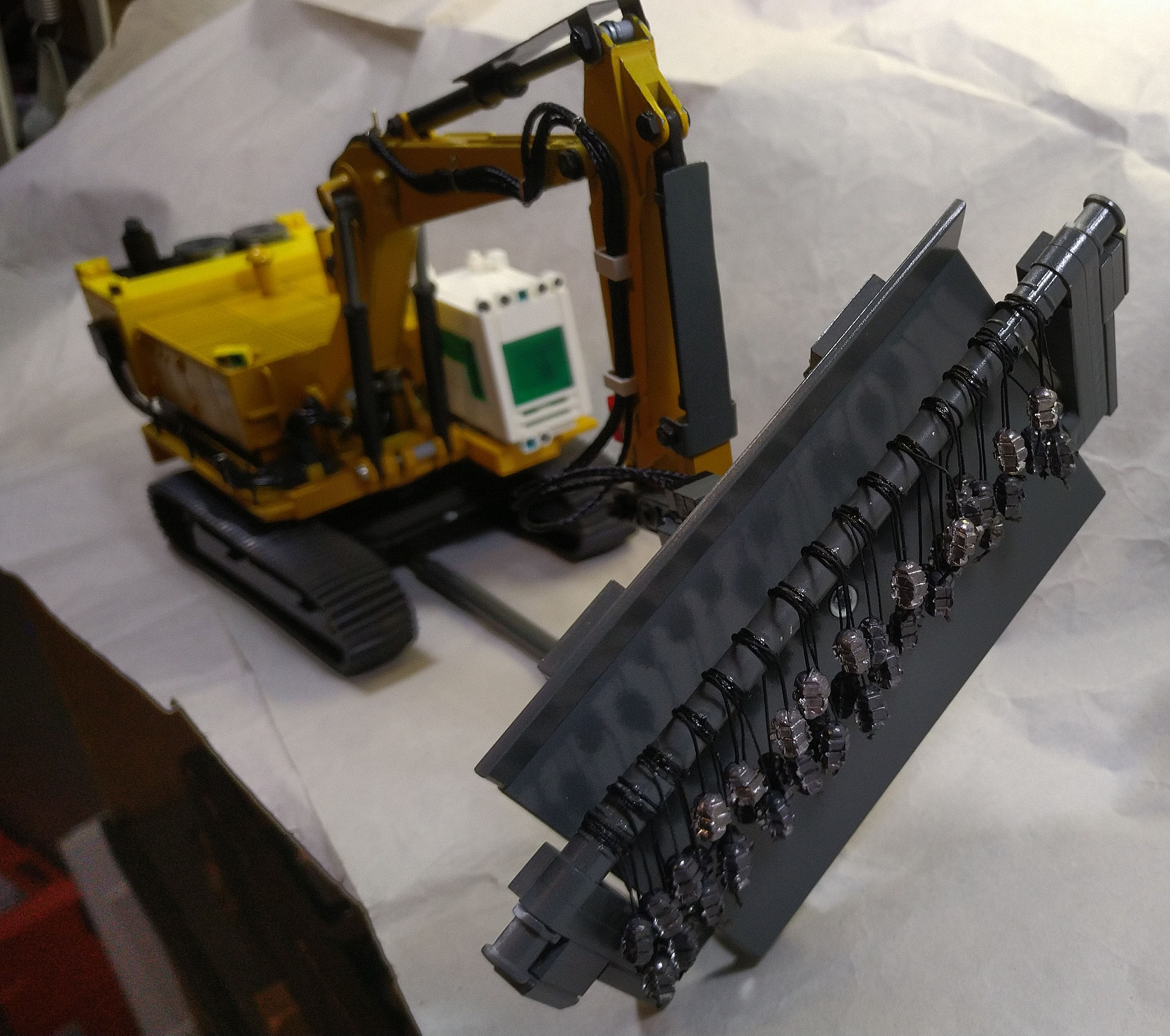 Mein freund Thomas hat sich mit einigen Modellen einem Thema gewidmet, das vor dem Hintergrund zur Zeit stattfindender Kriege eine ganz neue Brisanz und Aktualität hat: Minenräumung von Landminen. Fotos die er im Internet fand, haben ihn dazu bewogen einen Bagger gemäß den Vorbildfotos so umzubauen, dass man damit Landminen räumen kann. Basis ist ein Caterpillar Bagger. Zusatzaggregat, Räumgerät und Kabine entstanden dabei auch mit Teilen von LEGO.
