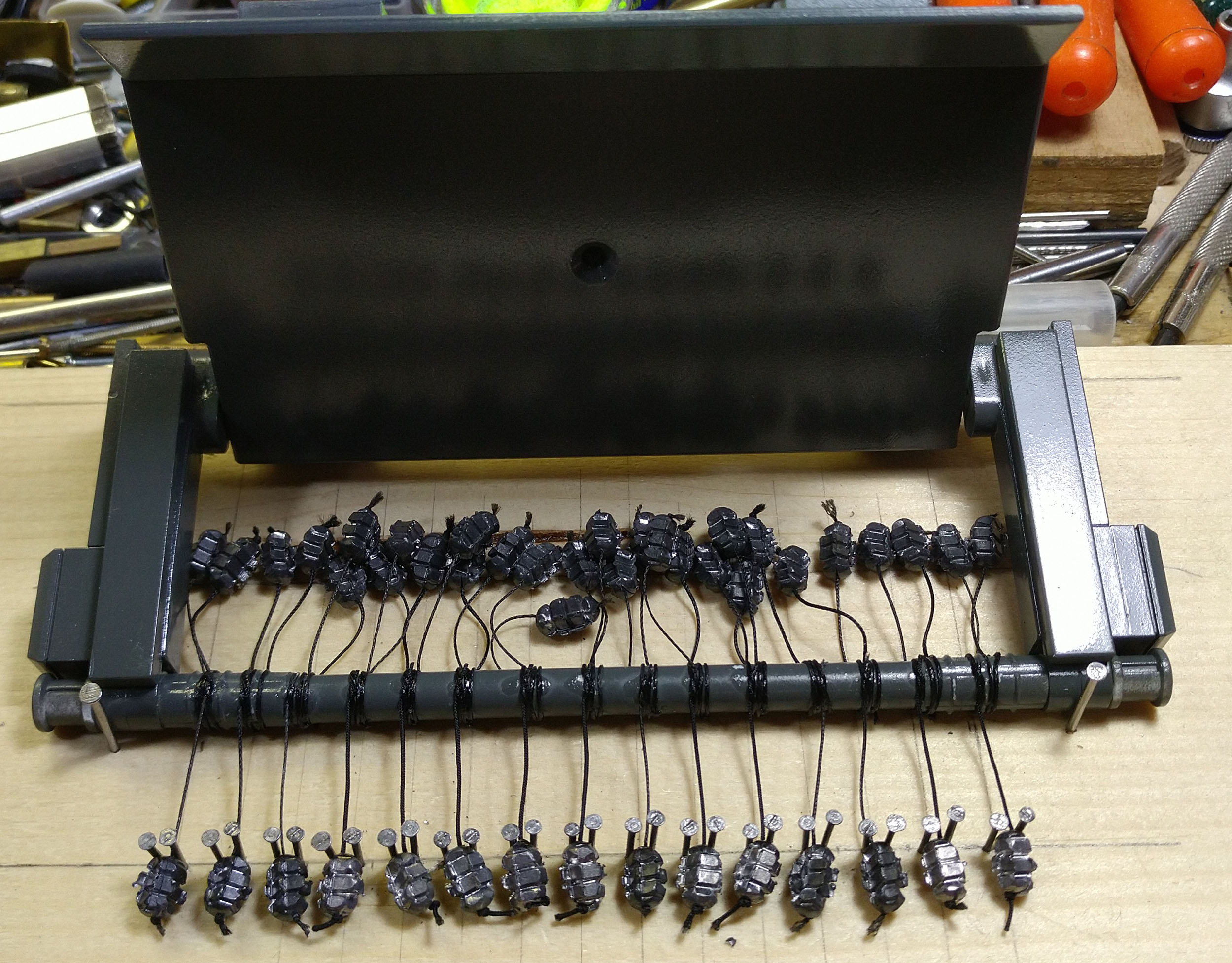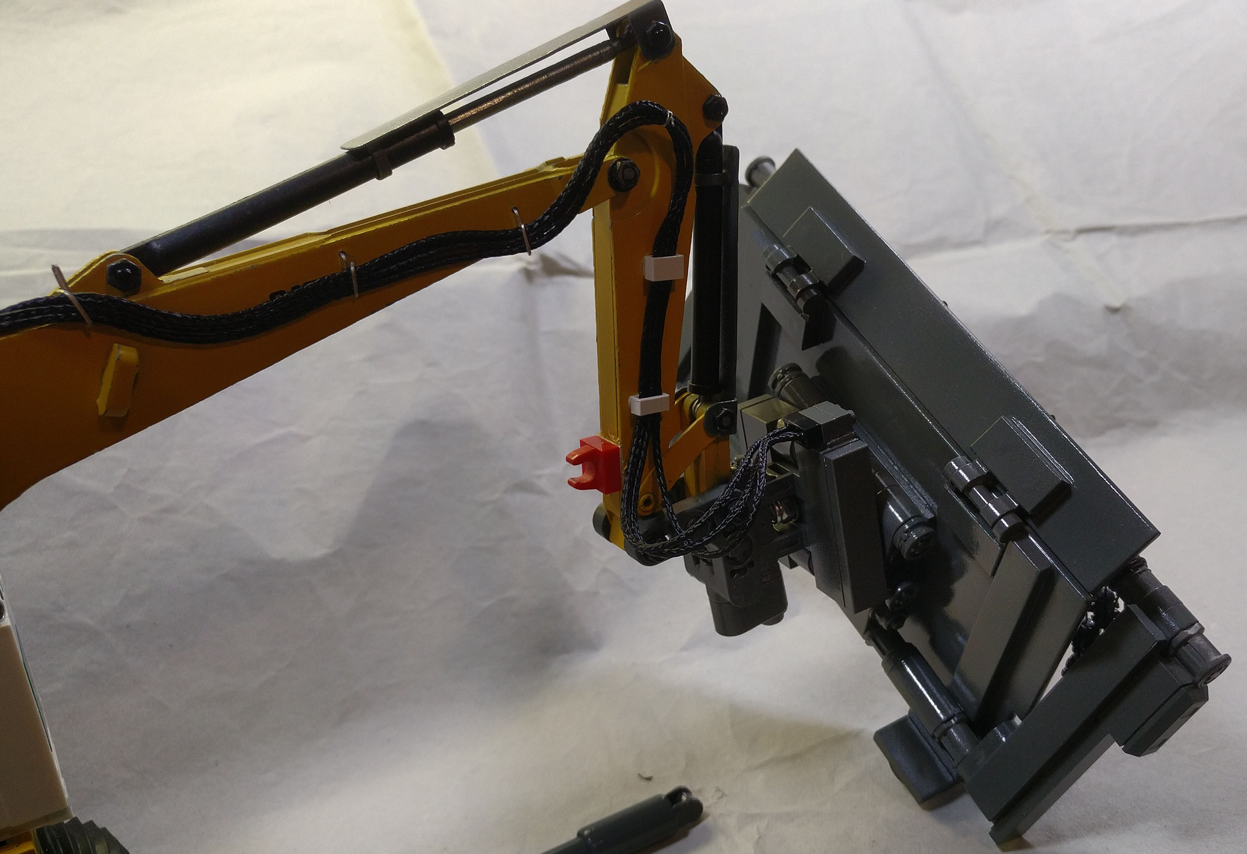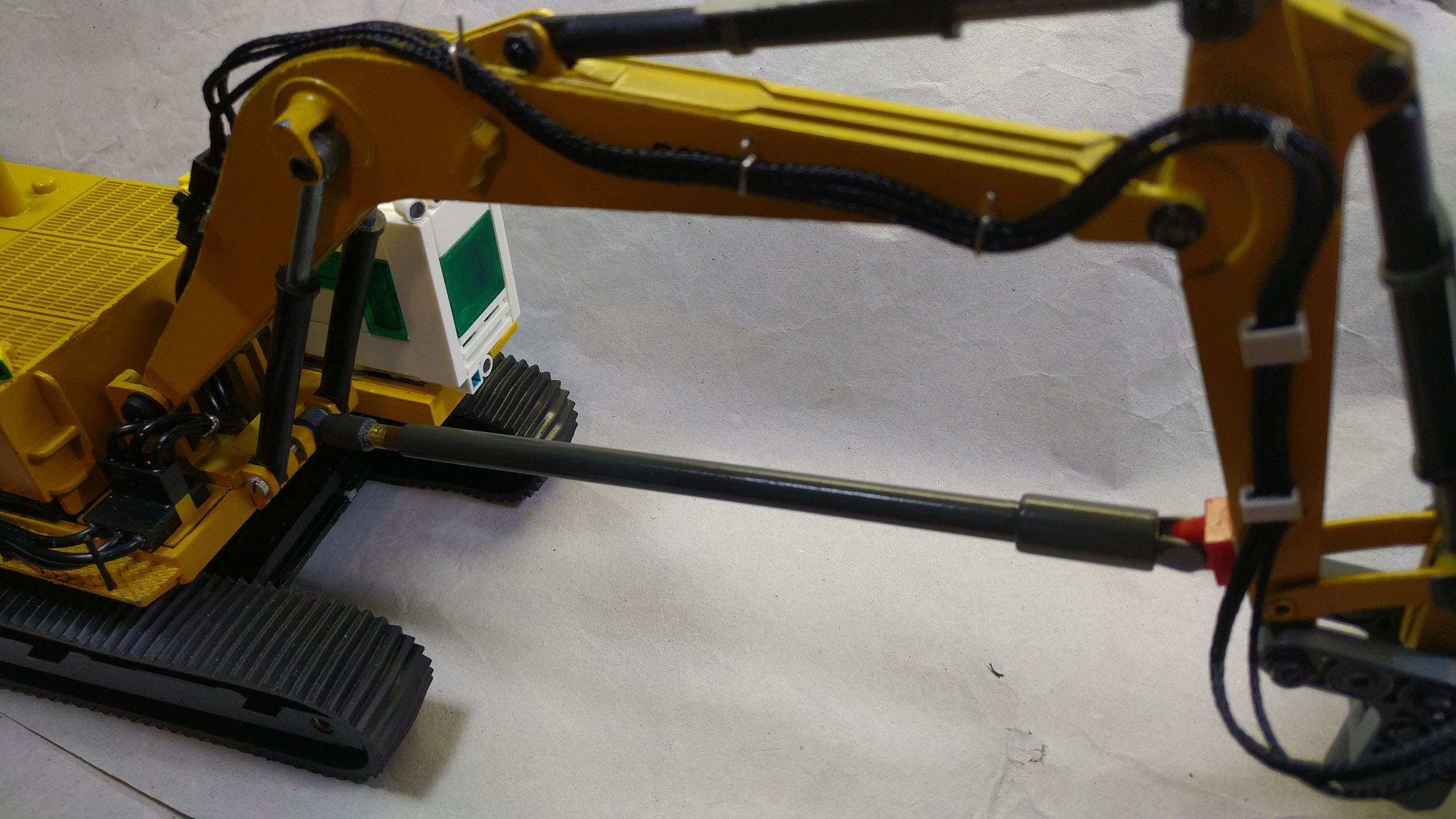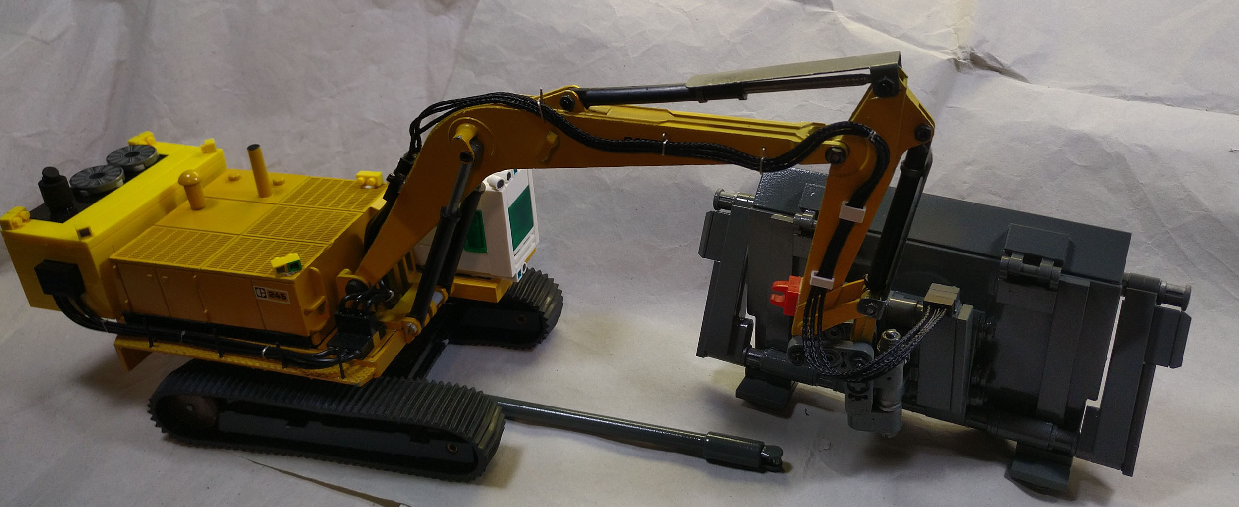 Mein freund Thomas hat sich mit einigen Modellen einem Thema gewidmet, das vor dem Hintergrund zur Zeit stattfindender Kriege eine ganz neue Brisanz und Aktualität hat: Minenräumung von Landminen. Fotos die er im Internet fand, haben ihn dazu bewogen einen Bagger gemäß den Vorbildfotos so umzubauen, dass man damit Landminen räumen kann. Basis ist ein Caterpillar Bagger. Zusatzaggregat, Räumgerät und Kabine entstanden dabei auch mit Teilen von LEGO.