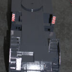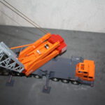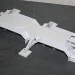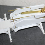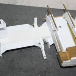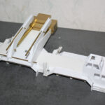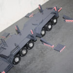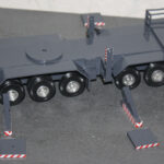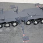 Ich entschied mich für die Lösung, zwei Darstellungen der Stützen möglich zu machen und deise dann entsprechend zu tauschen: Einmal in Arbeitsstellung mit ausgeklappten Stützen und einmal mit hochgeklappten Stützen für die Transportstellung. Außerdem habe ich den Bereich zwischen den vorderen und hinteren Kotflügeln gestaltet und zusätzliche Stützen am Heck das Kranes angebracht, damit ohne Hilfe eines zweiten Kranes der Mast aufgerichtet werden kann. Die Bilder dazu finden sich unten. Das Vorbild verfügte über große Stützplatten.