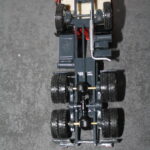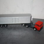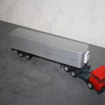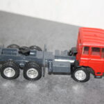 So auch im Falle dieser 3-achsigen DAF Zugmaschine. Das Modell, von dem die Kabine stammte war offenbar vom Vorbesitzer heiß geliebt und viel damit gespielt worden, was mich dazu bewog Ihr nochmals ein zweites Leben zu geben. Dehalb entfernte ich sie von dem arg ramponierten Fahrgestell und gab Ihrem Innenleben eine dem Einsatz passende Farbe. Das Fahrgestell mit Lenkung und Pendelachsen hinten ist selbst aus 5 mm Polystyrol gefräst, also Eigenbau, ebenso die Felgen mit Einsätzen und die Rahmenanbauteile wie Batteriekasten, Luftkessel, Tank und Auspuff. Der mit dem Modell eingetroffene türlose Auflieger erhielt eine Jalousie statt der Türen und Rückleuchten, sowie eine Zerlegung und farbliche Auffrischung. Auch die Felgen des Aufliegers wurden getauscht. So kann das Modell jetzt als echter niederländischer 1970iger Jahre Lastzug meine Sammlung bereichern.